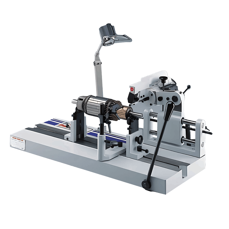 Kollektorfräsmaschine mit Handhebelbedienung. Auflageprismen in der Höhe und Länge verstellbar. Fräsapparat mit vierfacher wartungsfreier Kugelbüchsenführung und auf schwenkbarem Fräskopf. Einstellbare Anschläge zur Begrenzung der Fräslänge und verstellbarer Bedienungshebel. Die Konstruktion der Fräswellenführung erlaubt ein sehr nahes Ausfräsen der Nuten an die Fahne (Kamm).