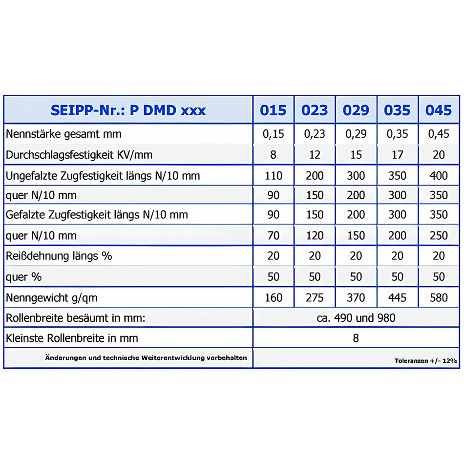 B DMD ist ein Laminat Vlies-Polyester-Vlies. Bei der Herstellung des Laminates wird ein hochtemperaturbeständiges Klebesystem verwendet, das die Folie einschließt und schützt. Die Beschichtung wird sehr gleichmäßig und unter hohen Temperaturen aufgebracht. Die Imprägnierung erreicht eine hundertprozentige Beschichtung mit einem Harz der Wärmeklasse H (180°C). Das verwendete Vlies ist für hohe Temperaturen geeignet und besitzt eine sehr gute Saugfähigkeit. Dies ist von allem für gleichmäßige Aufnahme von Tränkmitteln wichtig. Bis 180°C ist ein Schmelzen ausgeschlossen. B DMD ist mit den herkömmlichen Tränkharzen gut verträglich. Für B DMD verwenden wir eine hitzestabilisierte Polyesterfolie, um den Schrumpf bei 155°C zu reduzieren.